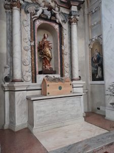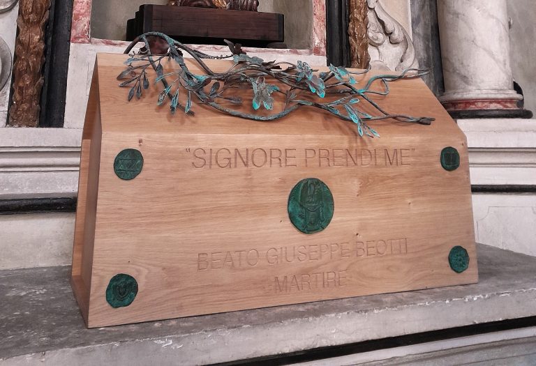 Nella cappella della Vergine (seconda a sinistra) è stata posizionata, in occasione della beatificazione avvenuta nel 2023, l’urna che contiene le reliquie di Don Giuseppe Beotti, appositamente realizzata dallo scultore Mario Branca. L’urna è in legno di rovere (cm 50 x 100) e alla sommità reca un intreccio arboreo di diverse essenze in rame saldato e appositamente ossidato che nascono da un unico tronco (sono essenze care alla Chiesa e al popolo ebraico cui è legata anche la storia di un salvataggio da parte di Don Beotti di alcuni ebrei): l’ulivo che indica la pace, la vite che indica fecondità e benedizione, la quercia simbolo della tenacia e il fico simbolo del paradiso terrestre. Nel fronte dell’urna cinque rilievi realizzati a fusione a cera persa: al centro il Pellicano che simboleggia il sacrificio di Cristo, ai lati una stella di David, un angelo, un fiore e un libro aperto. Sul legno è incisa la frase “SIGNORE, PRENDI ME” che Don Beotti disse nell’ultima messa prima del martirio, in basso “BEATO GIUSEPPE BEOTTI MARTIRE”.