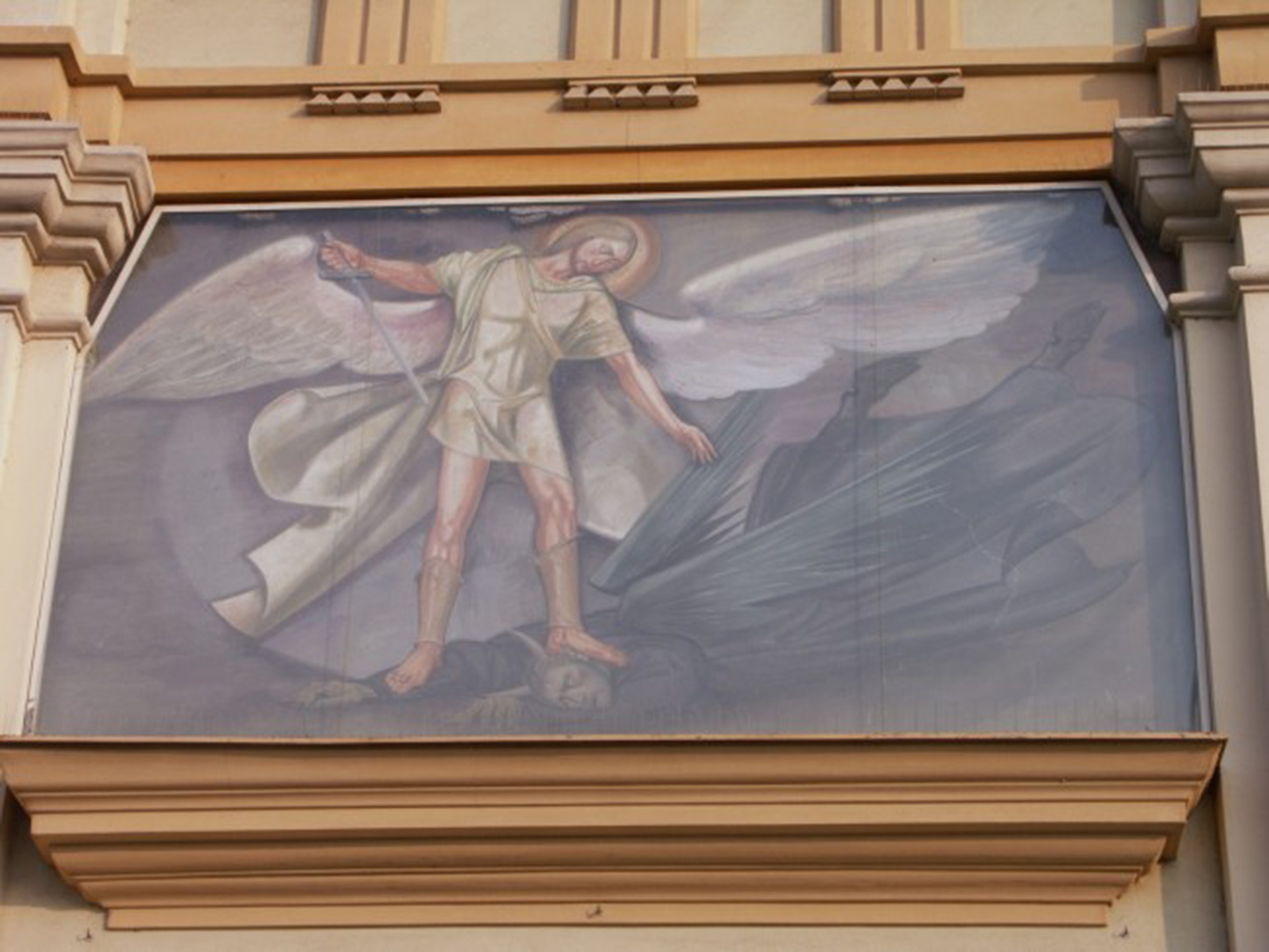 La facciata (1820) neoclassica è a capanna, su due ordini, tripartita e rinserrata agli angoli da lesene, presenta una trabeazione in aggetto decorata con triglifi. Tra le lesene centrali si apre l’unico portale, a luce rettangolare, al di sopra del quale il dipinto raffigurante l’arcangelo Michele