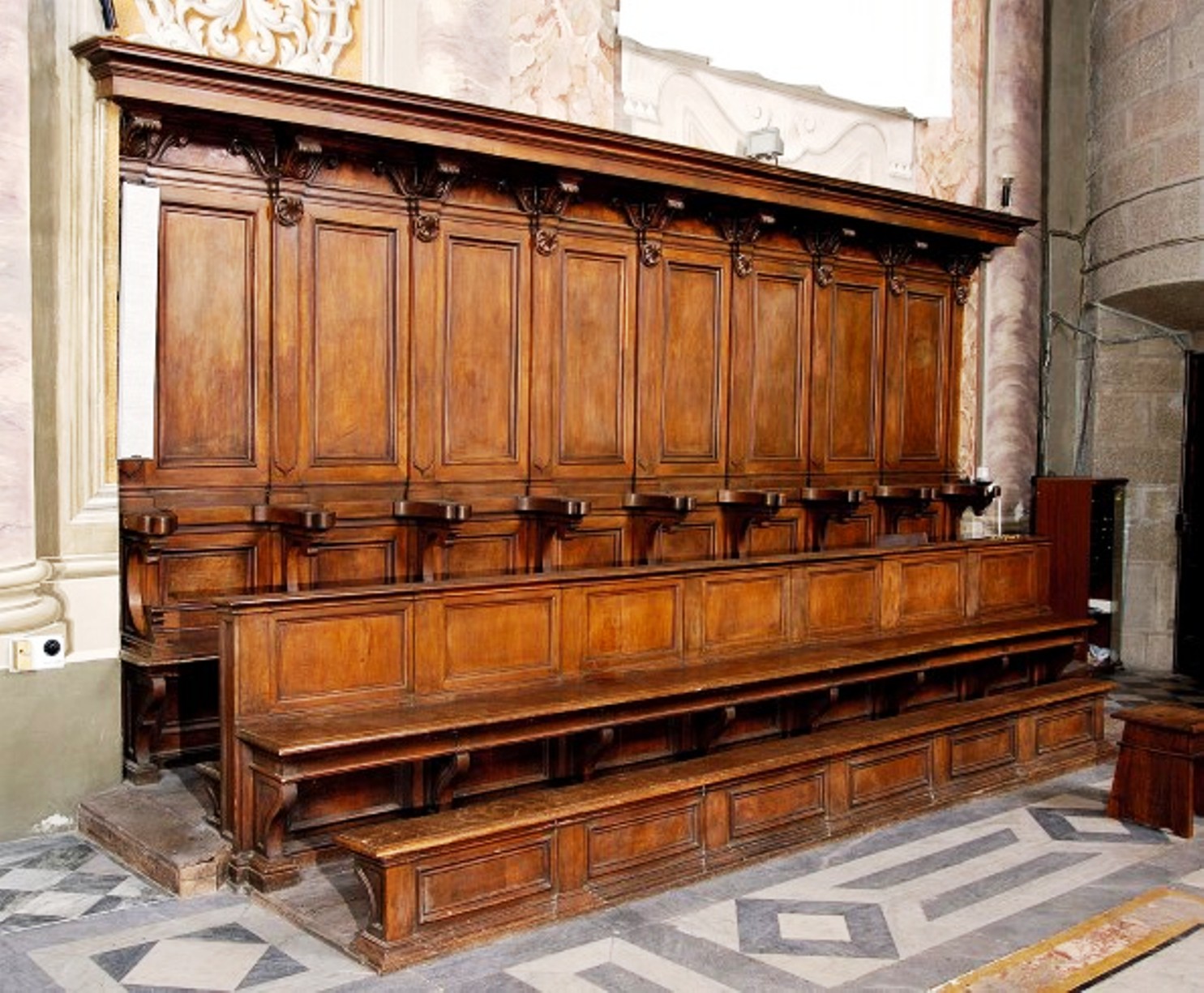 Il Coro fu ingrandito ed ornato grazie ai proventi legati al prodigio del Salvatore del 1442 [Signorelli]. La tribuna o Coro è nominata nel 1551 per decidere se realizzarla in pietra, in tufo o in laterizio. Nel 1560 fu fatta ricostruire dietro l’altare maggiore dal vescovo Sebastiano Gualterio, alla cui spesa partecipò il Comune con duecento scudi [Scriattoli]. Di un nuovo coro si fa menzione nel 1576 dando l’appalto a Finiziano di Gradoli che lo avrebbe dovuto realizzare di color nero, con un leggio bellissimo come quello della chiesa di S. Maria in Gradi. La disposizione di tale opera fu data dal vescovo Carlo Montigli (1576-1594). Sarà Urbano Sacchetti a far ampliare, nel 1683, il bel coro dei canonici di ventotto ordini di posti, a doppia fila, distruggendo i muri affianco dell’abside maggiore. A sinistra, dove il coro assume una forma più sontuosa, è scolpito nel legno lo stemma del Sacchetti [Galeotti]. Gli stalli del Coro, datati tra il 1683 e io 1699 sono in legno di noce scolpito e intagliato. Semplici ma raffinati i seggi distinti da singoli dossali dalla linea ondulante. Si innalza sopra l’alto dossale liscio e listato da sottili cornici. Ogni specchio di dossale è separato dall’altro da una lesena addossata coronata da una mensoletta con conchiglia sulla quale si imposta un’altra mensola a fogliami. Al di sopra un cornicione aggettante. Lo stemma del card. Sacchetti è apposto sul fregio del coro. È un buon lavoro, di fattura semplice ma raffinata [Pampalone].