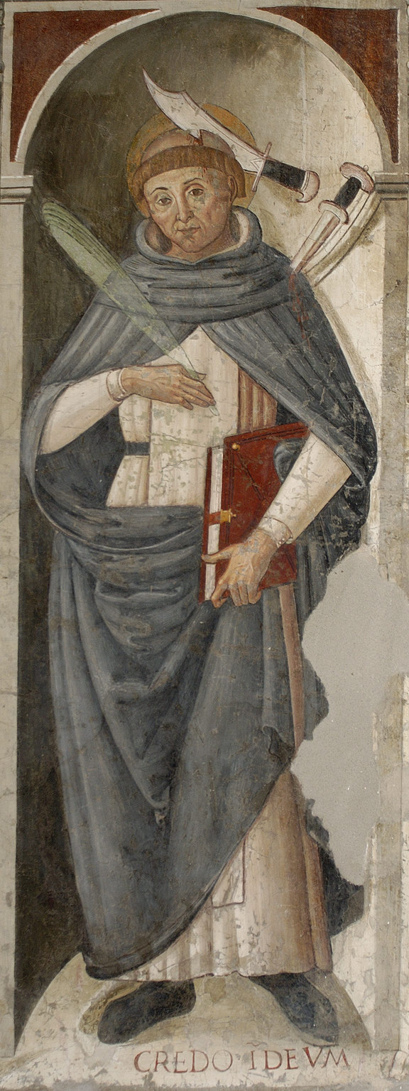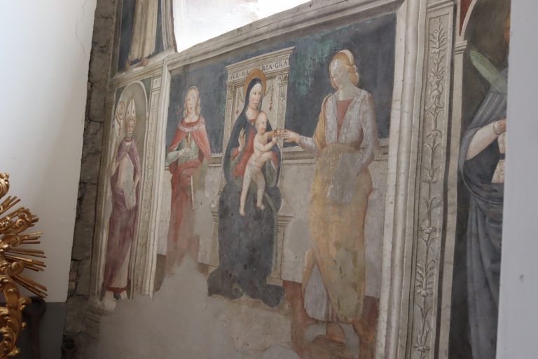 In basso lo Sposalizio mistico di santa Caterina. Al centro della composizione è la Vergine – seduta su un trono a pilastrini sorreggenti un architrave – che tiene il bambino ritto in piedi in atto di infilare l’anello a santa Caterina di Alessandria, in piedi sulla destra del trono. A sinistra del trono è invece santa Caterina da Siena, con veste verde e manto rosa, con la croce nella destra e un libro nella sinistra. Eseguito nel momento in cui la chiesa subiva all’interno lavori di abbellimento, l’affresco si presenta come esempio abbastanza interessante della scuola del Pastura, che esercitò una attività piuttosto nutrita in tutta la zona laziale. Alcune incertezze o elementi grossolani (come lo sproporzionato anello e le affinatissime dita di santa Caterina) interrompono qua e là il tono modesto, ma schietto, della composizione [Pampalone].
