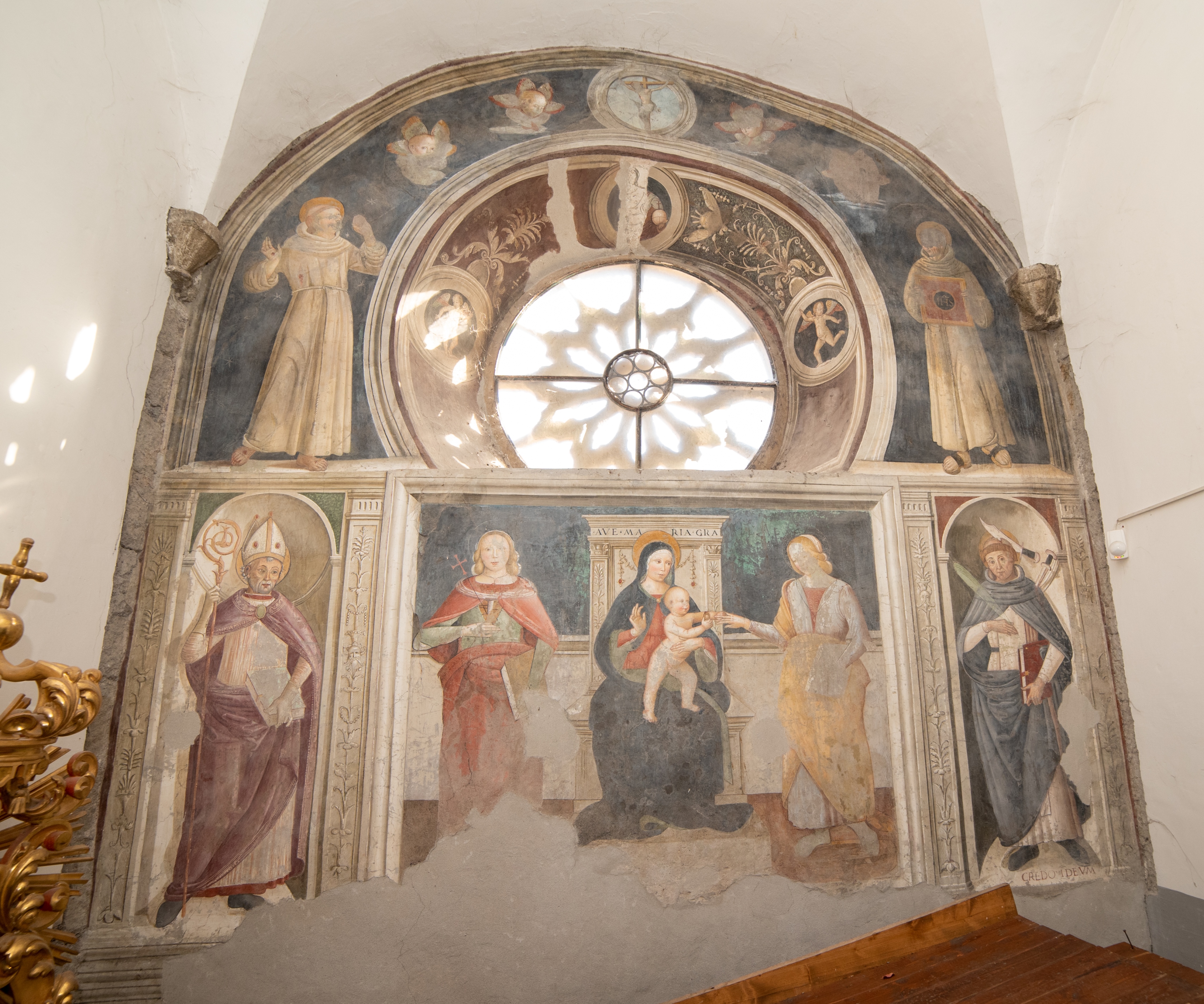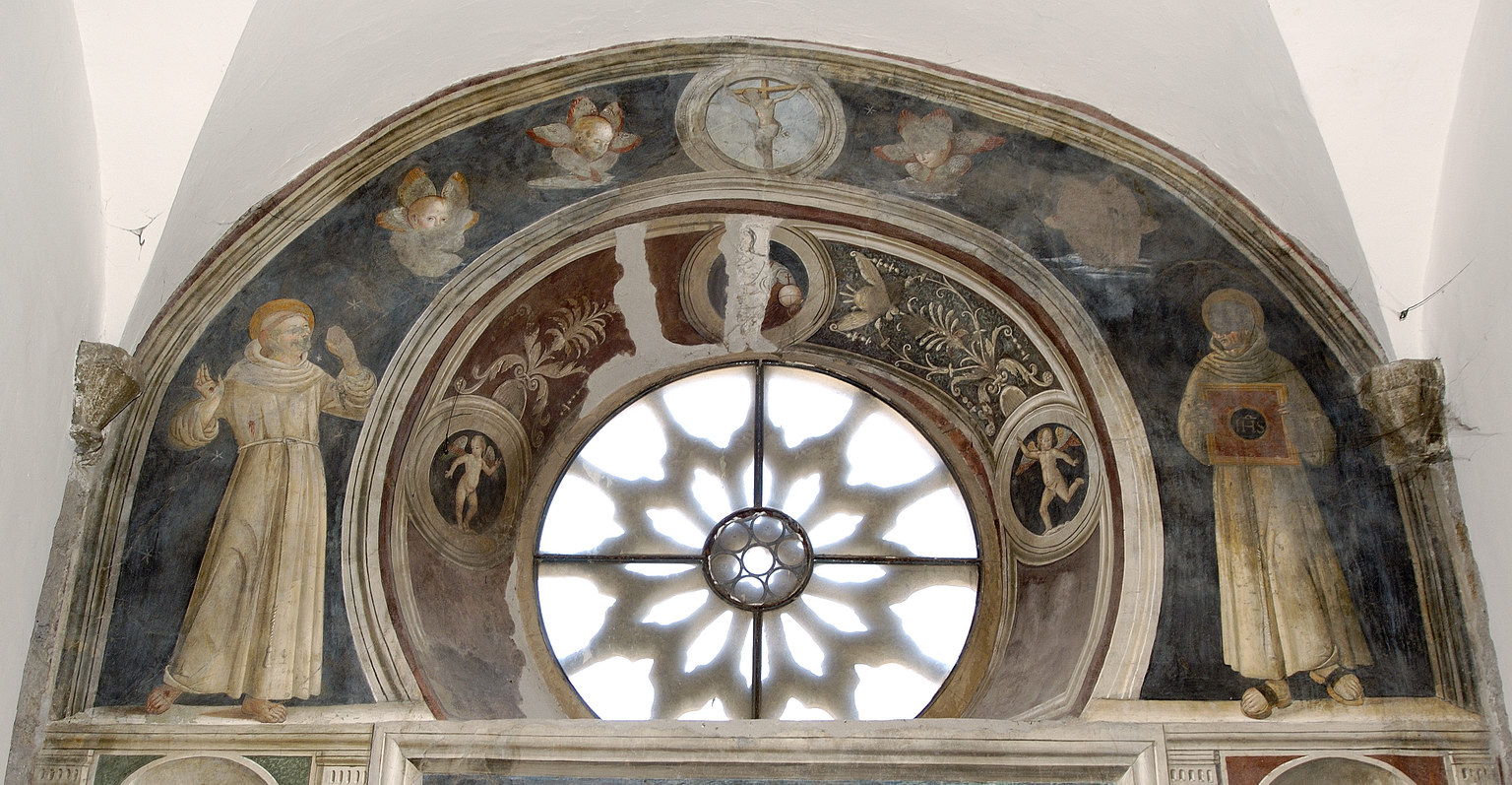 Nel sottarco della finestra sono raffigurati San Francesco e san Bernardino. A sinistra del rosone è san Francesco, in piedi, in abito monastico, con le braccia aperte per ricevere le stimmate. A destra del rosone è san Bernardino con la tonaca grigia, e tra le mani regge una tavoletta rossa col segno di Cristo. Al di sopra del rosone, entro un medaglione, è dipinto un Crocifisso fra due teste di cherubini. Nello sguincio è al centro un medaglione con l’Eterno, ai lati altri due medaglioni con putti. Nelle zone vuote decorazioni a tralci di foglie. È il registro superiore della parete affrescata con lo Sposalizio mistico di santa Caterina. Più che nelle figure è nella decorazione del sottarco del rosone che si nota il provincialismo di tono modesto del lavoro[Pampalone].