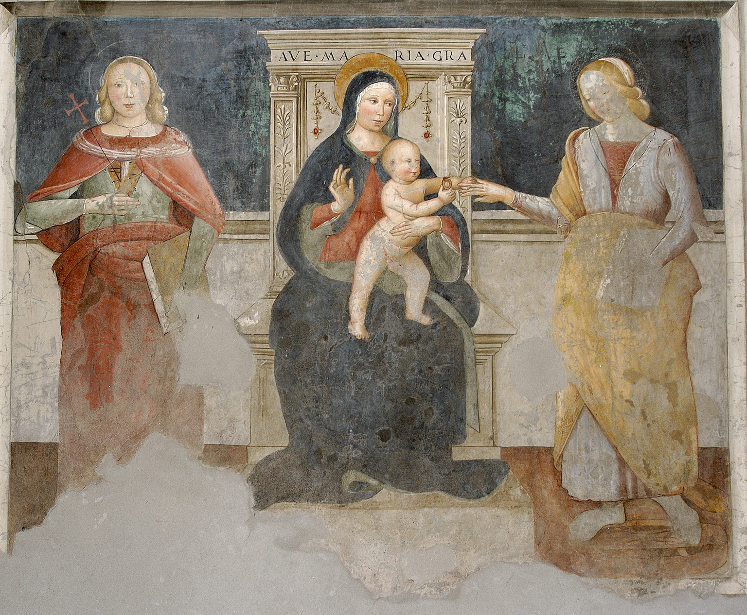 La cappella è abbellita da alcuni affreschi, tra cui quello raffigurante la Vergne assisa su un trono, recante la scritta “Ave Maria gra.”. Pampalone lo descrive come un frammento di affresco raffigurante la Madonna, su un trono marmoreo con decorazioni tipiche del tardo gotico, sorreggente il Bambino sulle ginocchia, mentre un angelo accorre da destra, in volo. La composizione è su sfondo azzurro. Un’ampia lacuna ricopre il corpo dell’angelo mentre una grossa crepa traversa diagonalmente il volto della Vergine. Nel programma dei lavori di restauro e abbellimento che si attuò nella chiesa tra fine 1300 e i primi del 1400 deve sicuramente collocarsi anche questo affresco di fattura piuttosto raffinata [Pampalone].