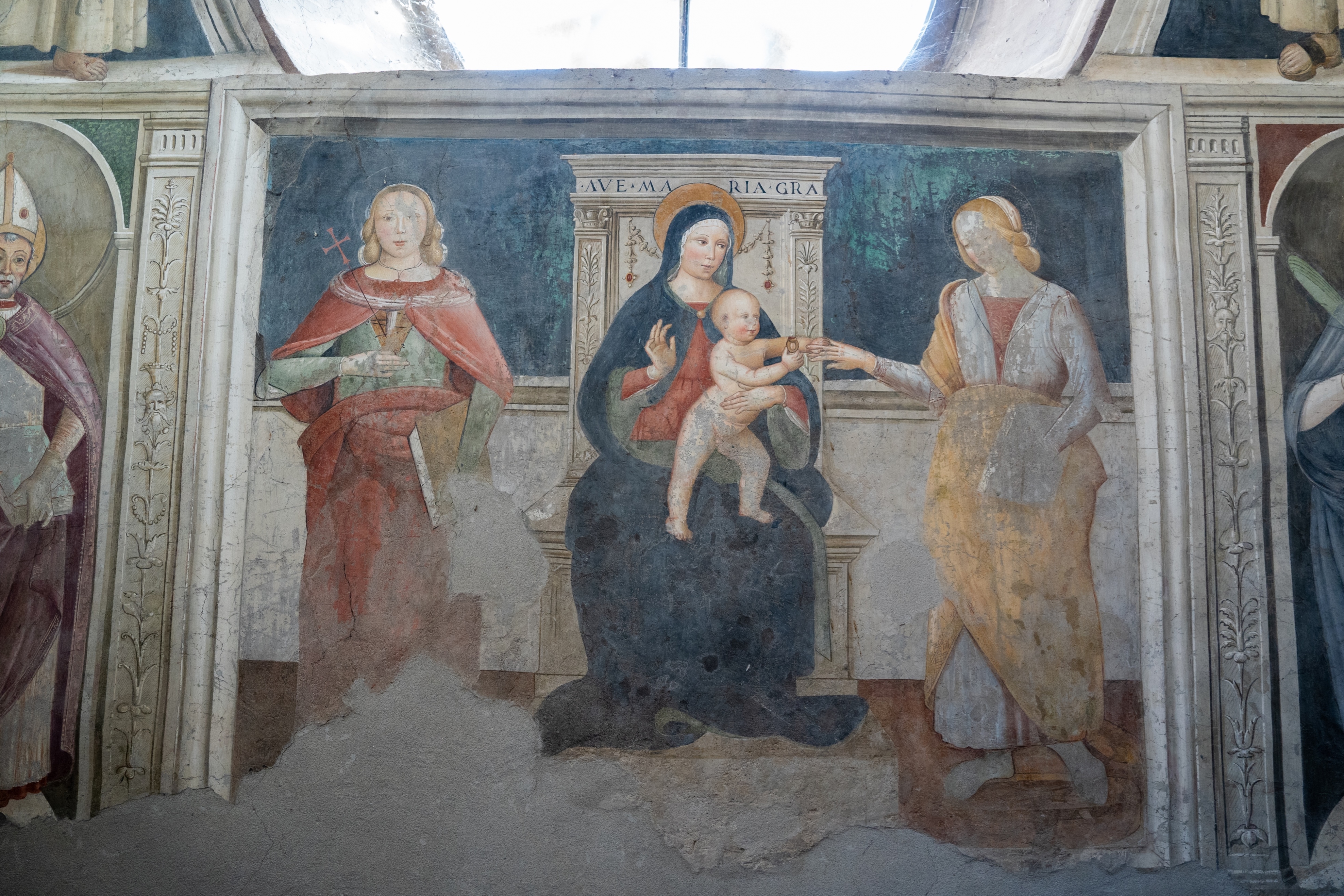 In basso lo Sposalizio mistico di santa Caterina. Al centro della composizione è la Vergine – seduta su un trono a pilastrini sorreggenti un architrave – che tiene il bambino ritto in piedi in atto di infilare l’anello a santa Caterina di Alessandria, in piedi sulla destra del trono. A sinistra del trono è invece santa Caterina da Siena, con veste verde e manto rosa, con la croce nella destra e un libro nella sinistra. Eseguito nel momento in cui la chiesa subiva all’interno lavori di abbellimento, l’affresco si presenta come esempio abbastanza interessante della scuola del Pastura, che esercitò una attività piuttosto nutrita in tutta la zona laziale. Alcune incertezze o elementi grossolani (come lo sproporzionato anello e le affinatissime dita di santa Caterina) interrompono qua e là il tono modesto, ma schietto, della composizione [Pampalone].