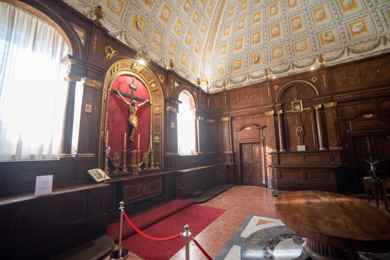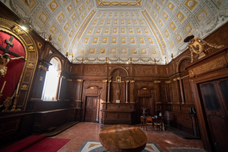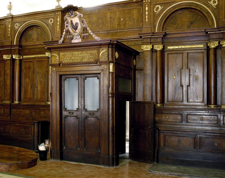 E’ formata da un’ampia sala con arredamenti in noce, arricchiti da capitelli e dorature, opera del viterbese Giuseppe Antolini, architetto, che li disegnò, e di Luigi Cappuccini, ebanista, che li realizzò [Galeotti]. Il vasto ambiente rettangolare al quale si accede attraverso un piccolissimo ambiente che collega alla navata sinistra. Sul portale ligneo un grandioso stemma in legno dipinto del card. Gallo. Sulla parete di fondo si aprono due finestre ai lati di un altare centinato. Il soffitto è dipinto a finti lacunari, entro alcuni dei quali figura lo stemma de card. Gallo. Al centro della volta il quadro opera di Carlo Maratta (1625-1713), oggi nella navata di sinistra.