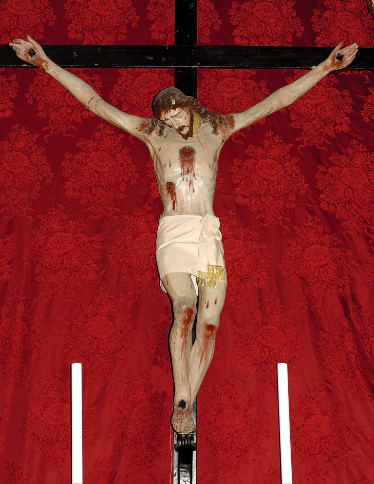 Al centro un Crocifisso ci cartapesta del XVII secolo, raffigura il Cristo in croce coperto con un perizoma di stoffa con ricami in oro, opera di maestranze artigiane locali [Pampalone].
