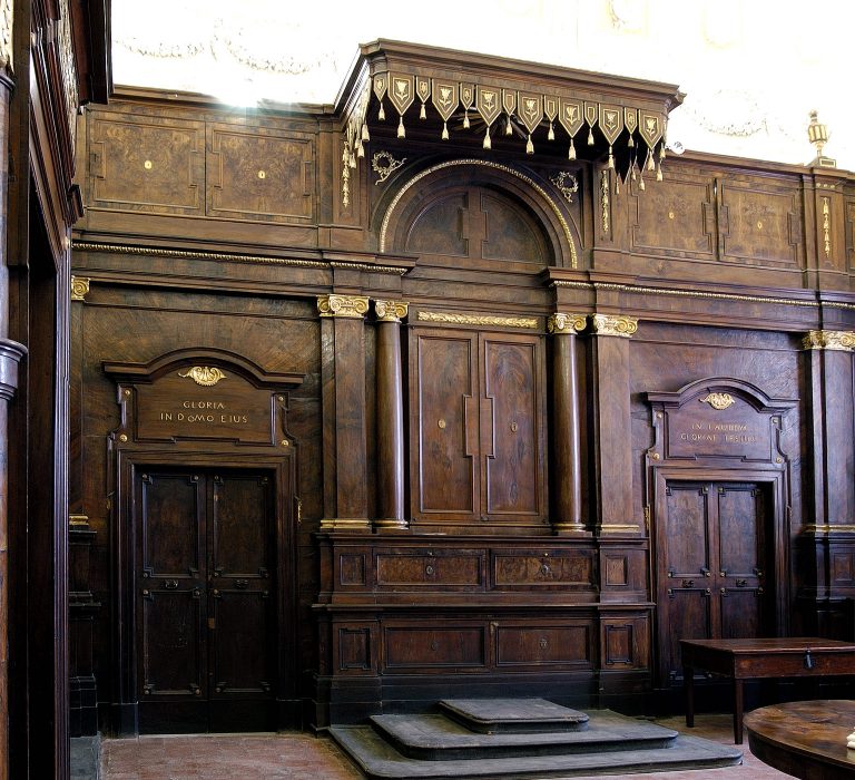 Piuttosto elegante e fine l’esecuzione degli armadi, in specie nella soluzione intorno alle due finestre dove il paramento ligneo sembra diventare elemento architettonico che fa da cornice alle due aperture. Gli sportelli e i pannelli sono finemente sagomati, riquadrati da colonne coronate d capitelli dipinti a finto oro, così come i festoni che raccordano le colonne [Pampalone].