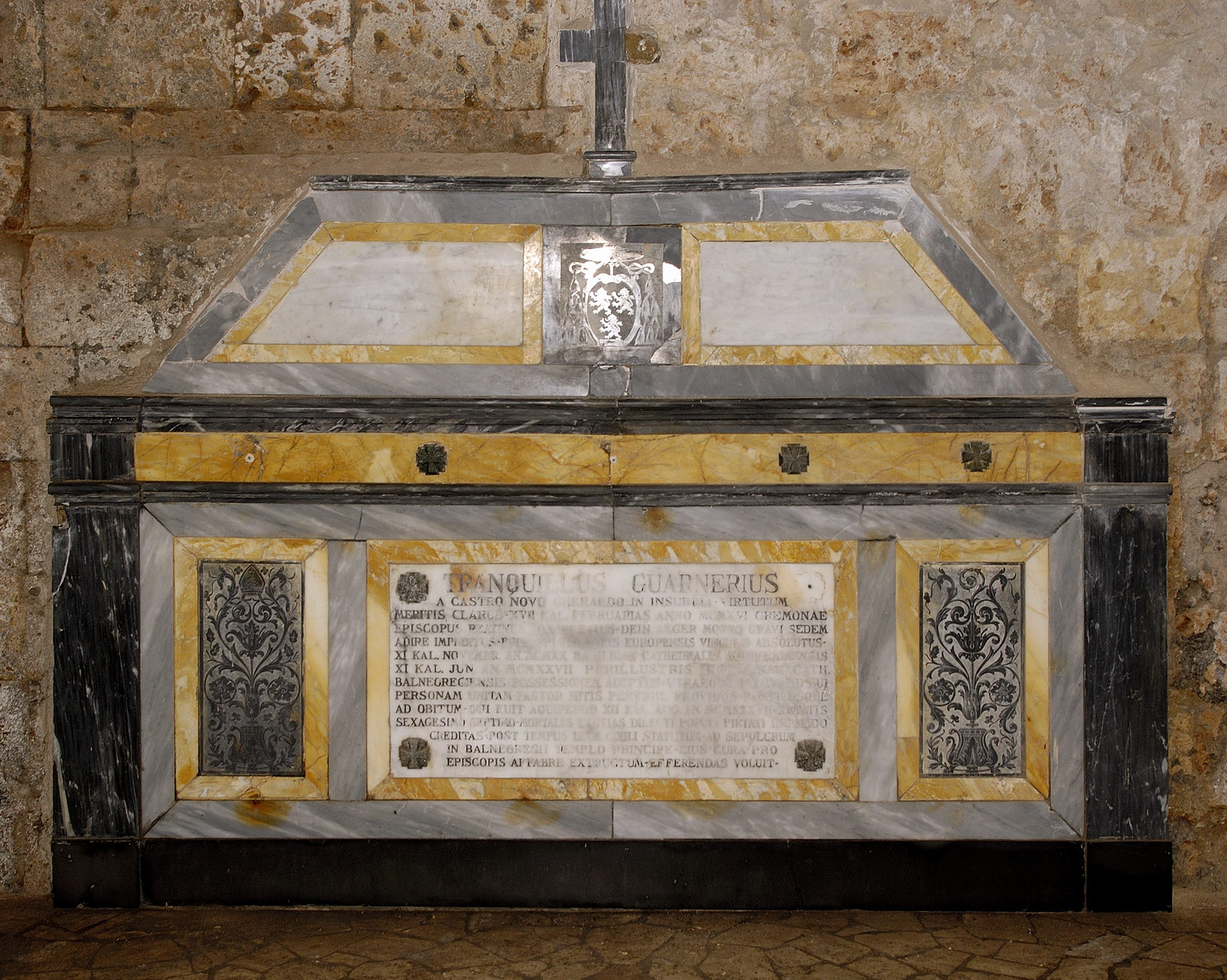 L’altare, con cippo, mensa e pedana è in pietra di Bagnoregio, sul davanti del piccolo cippo che regge la mensa sono raffigurati, in ferro, pastorale e mitra.