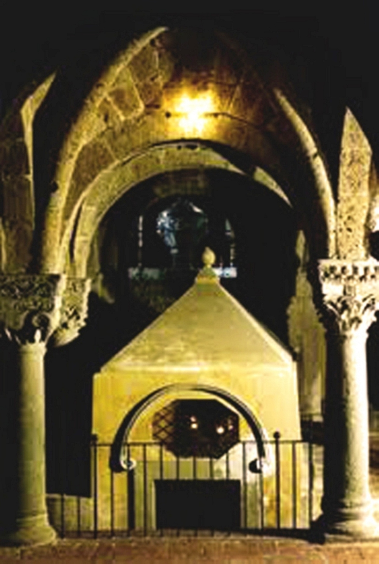 La cripta venne realizzata in maniera tale che la parte superiore del sacello del santo Sepolcro emergesse e fosse visibile attraverso un’apertura delle volte, nella zona antistante l’abside della chiesa soprastante. Tutto ciò per permettere ai fedeli transitanti in chiesa la visione del sacello e mantenere costante il simbolismo della Passione e della morte di Gesù. Una doppia balaustra di ferro è posta sui margini della profonda apertura.