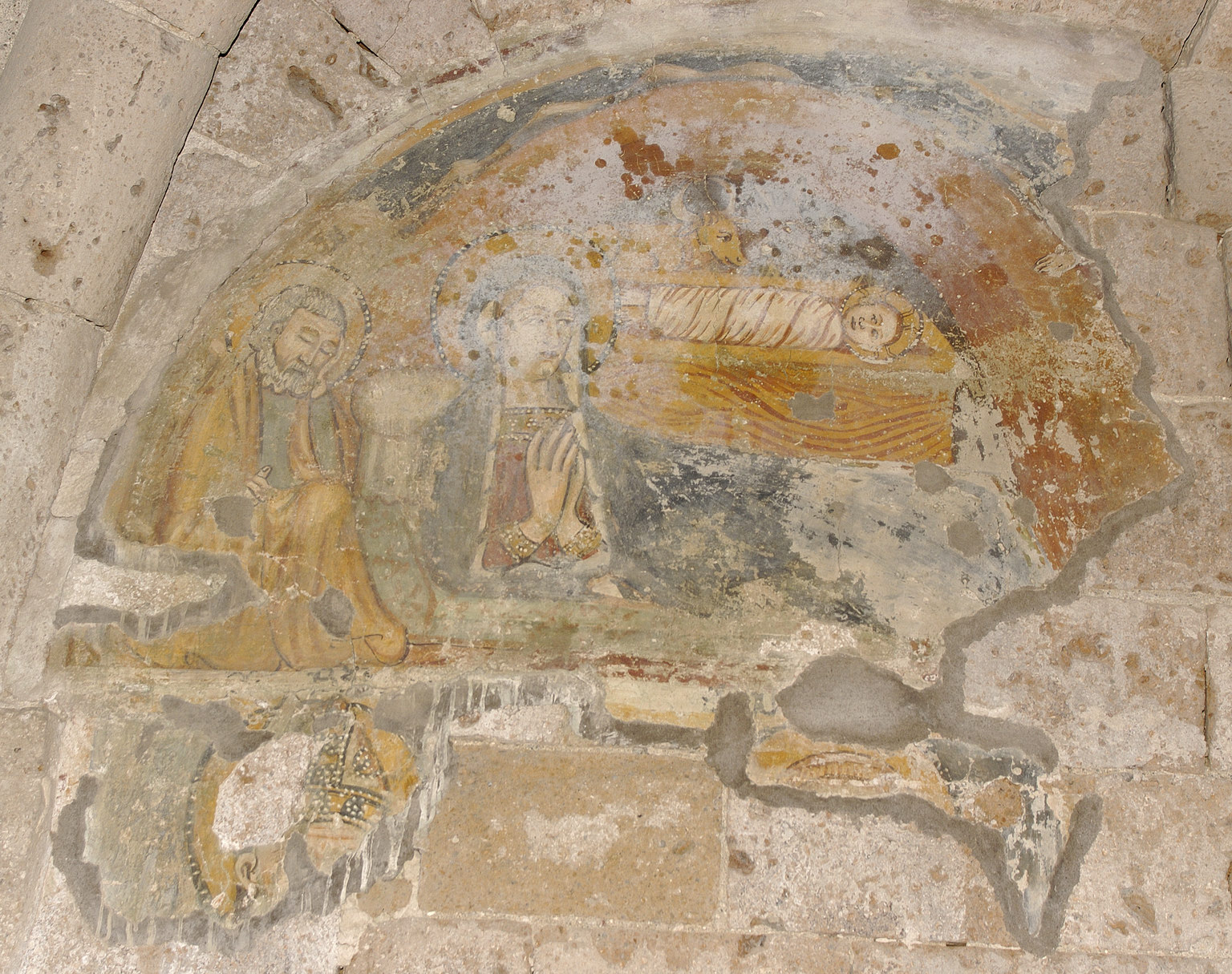 A destra della scala una Natività che potrebbe risalire al XIV secolo: Gesù Bambino, avvolto in fasce riposa sopra un grande letto mentre, in primo piano, la Madonna e san Giuseppe sono inginocchiati in atteggiamento di contemplazione e adorazione. Al di là del letto il bue e l’asino. Il Bambino Gesù, la Madonna, s. Giuseppe e gli animali sono ancora perfettamente visibili. Non esistono più le altre figure che si intravedono al di sotto. La Madonna veglia davanti al Bambino avvolto in fasce; s. Giuseppe, un po’ più piccolo della Madonna, riposa seduto.
