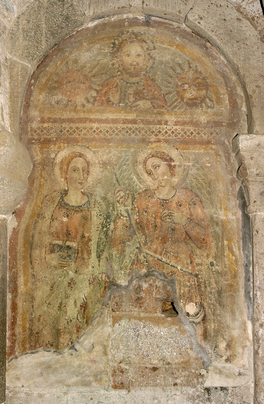 Nelle altre pareti della cripta ci sono altri due altari: a sinistra, nello spazio dell’arco, Dio creatore benedicente con ai lati sole e luna. Sotto, ben visibili, sono le figure di Santa Caterina d’Alessandria, con il libro nella mano sinistra e san Michele arcangelo con la spada e la bilancia. Attribuibile ad un artista senese del XV secolo (esclusa la lunetta)