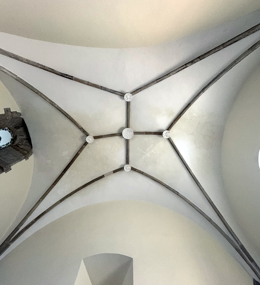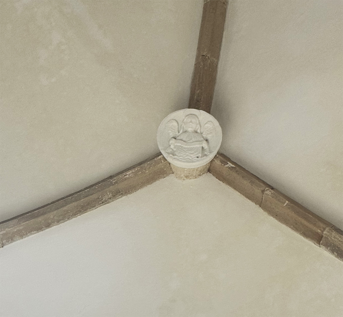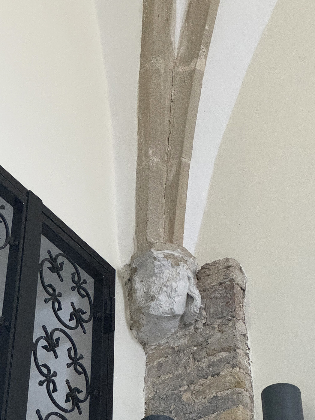 Nel contesto della diffusa compresenza tra elementi antichi, moderni e contemporanei testimoni delle numerose distruzioni e ricostruzioni di ampie parti della Concattedrale di San Tommaso Apostolo ad Ortona, spicca, per saggezza costruttiva e conservazione, l’esame dell’aula rettangolare adibita a sacrestia e a sala capitolare, situata allo stesso livello del presbiterio, a sinistra. Già segnalata da Ignazio Carlo Gavini nel suo monumentale studio sulla storia dell’architettura in Abruzzo edito nel 1927-1928, egli ne colse il legame con la copertura voltata secondo un sistema gotico a padiglione in uso in Inghilterra nel tredicesimo secolo, riconoscendone il carattere di esperienza architettonica isolata rispetto al contesto regionale. A livello tipologico, emergono sulla volta dell’aula, quattro vele triangolari segnate da interessanti costoloni litici impostate su altrettante teste mensola collocate ai quattro angoli della sala capitolare, mentre al centro e negli incroci delle nervature si osservano rispettivamente lo stemma di San Bernardino da Siena e i quattro simboli degli Evangelisti. Nel contesto, di estremo interesse, spiccano, per vivacità compositiva e varietà fisiognomica, le teste mensola con capitello pentagonale su peducci di età svevo-angioina (1280-1300 circa), e la finestra monofora gotica, estremamente alta e trilobata, con ampia strombatura verso l’interno della sala capitolare.