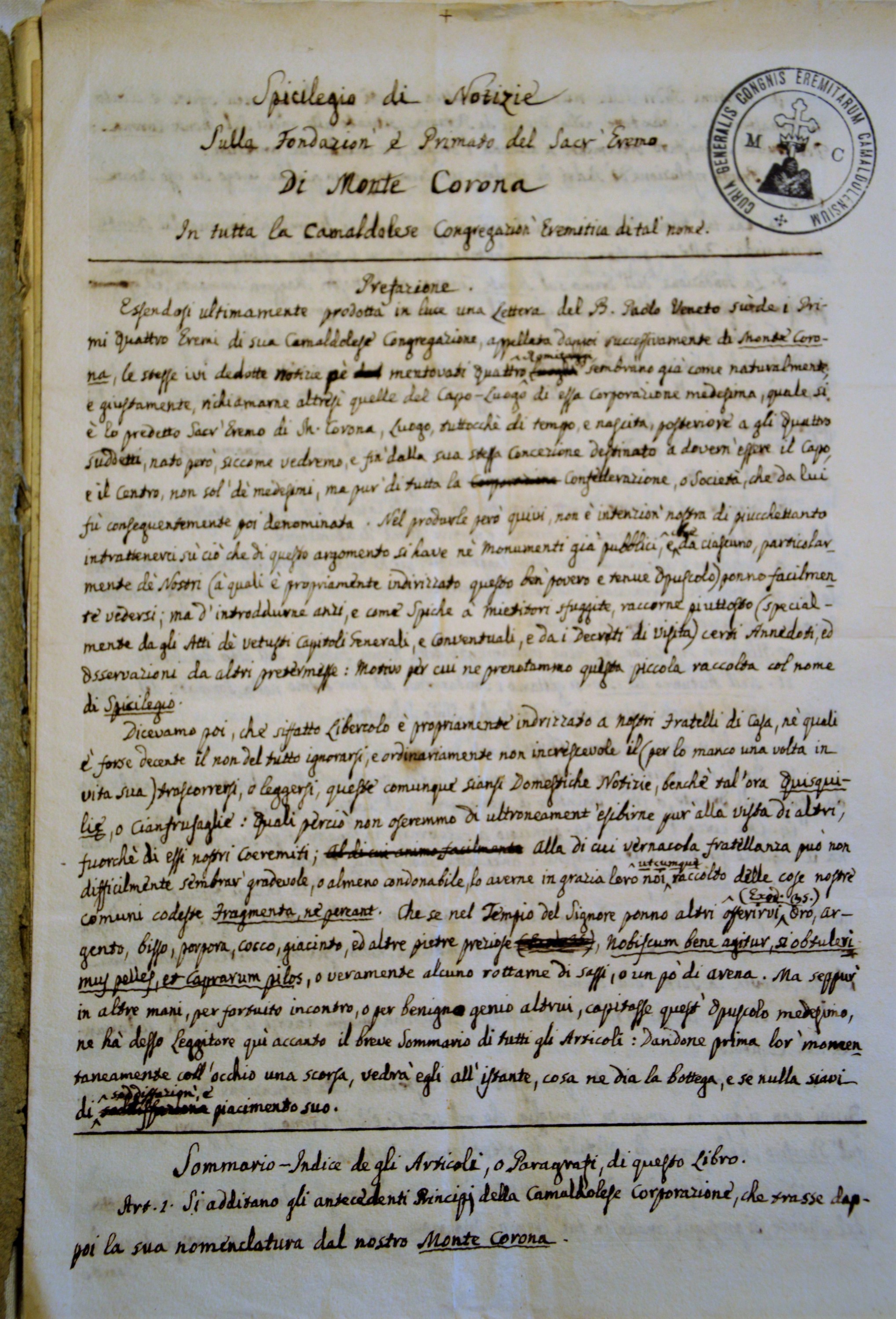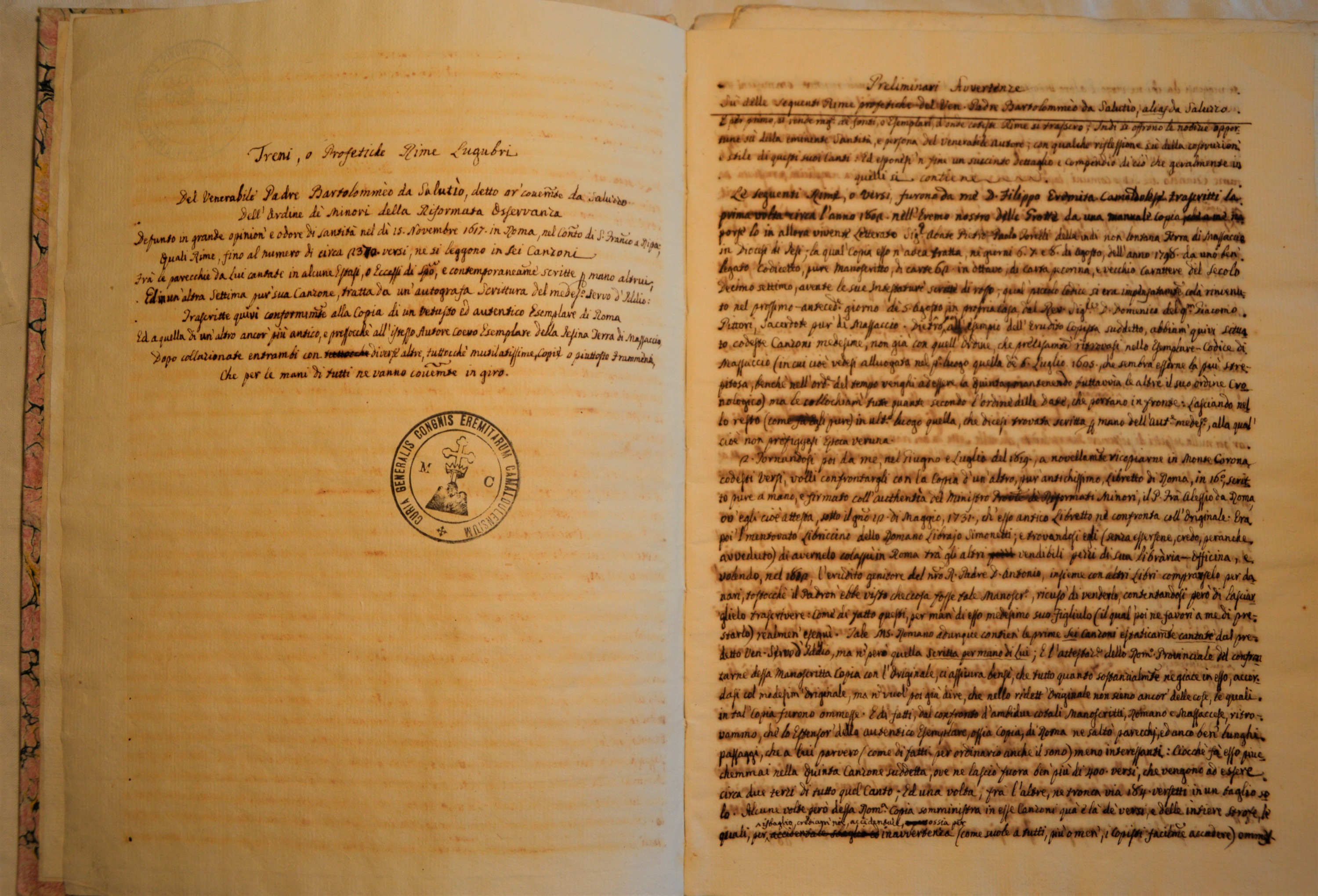 Don Filippo Palmieri z Barchi (1762–1827) od pierwszych lat XIX wieku pełnił funkcję historyka Eremu, a ponadto podjął się transkrypcji rękopisów błogosławionego Pawła Giustinianiego. Było to konieczne ze względu na trudność ich zrozumienia, wynikającą nie tyle z pisma błogosławionego, ile z używanej przez niego gramatyki i składni, co czyniło lekturę jego tekstów praktycznie niemożliwą dla ówczesnych mnichów.