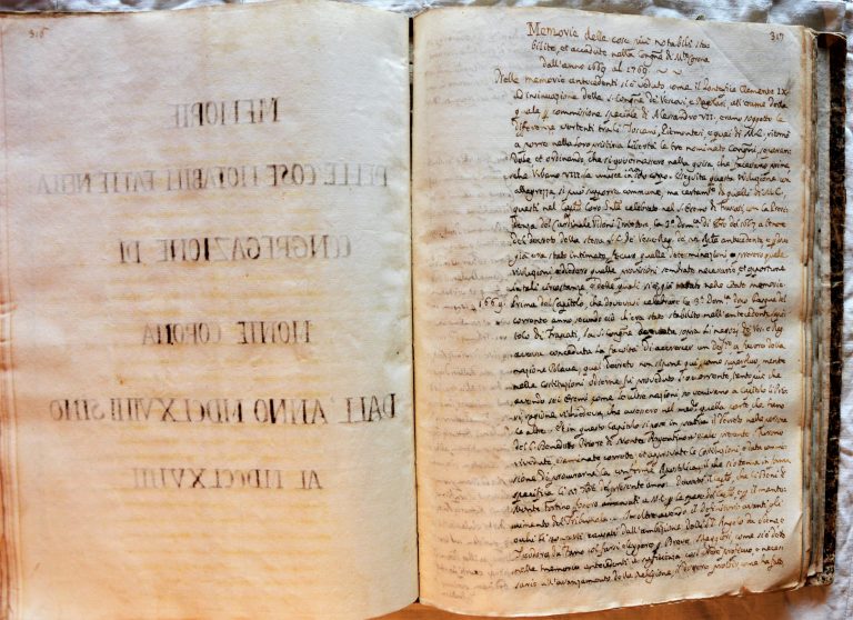 Dal manoscritto “Indice generale di tutte le scritture dell’Archivio tribunalizio compilato nell’anno MDCCLVI”, scritto dal padre Tiburzio Calimani da Venezia (1709-1774), così come in seguito dalle opere del padre Filippo Palmieri da Barchi (1762-1827) possiamo ricavare i primi dati per la descrizione della storia dell’Archivio e della Biblioteca.