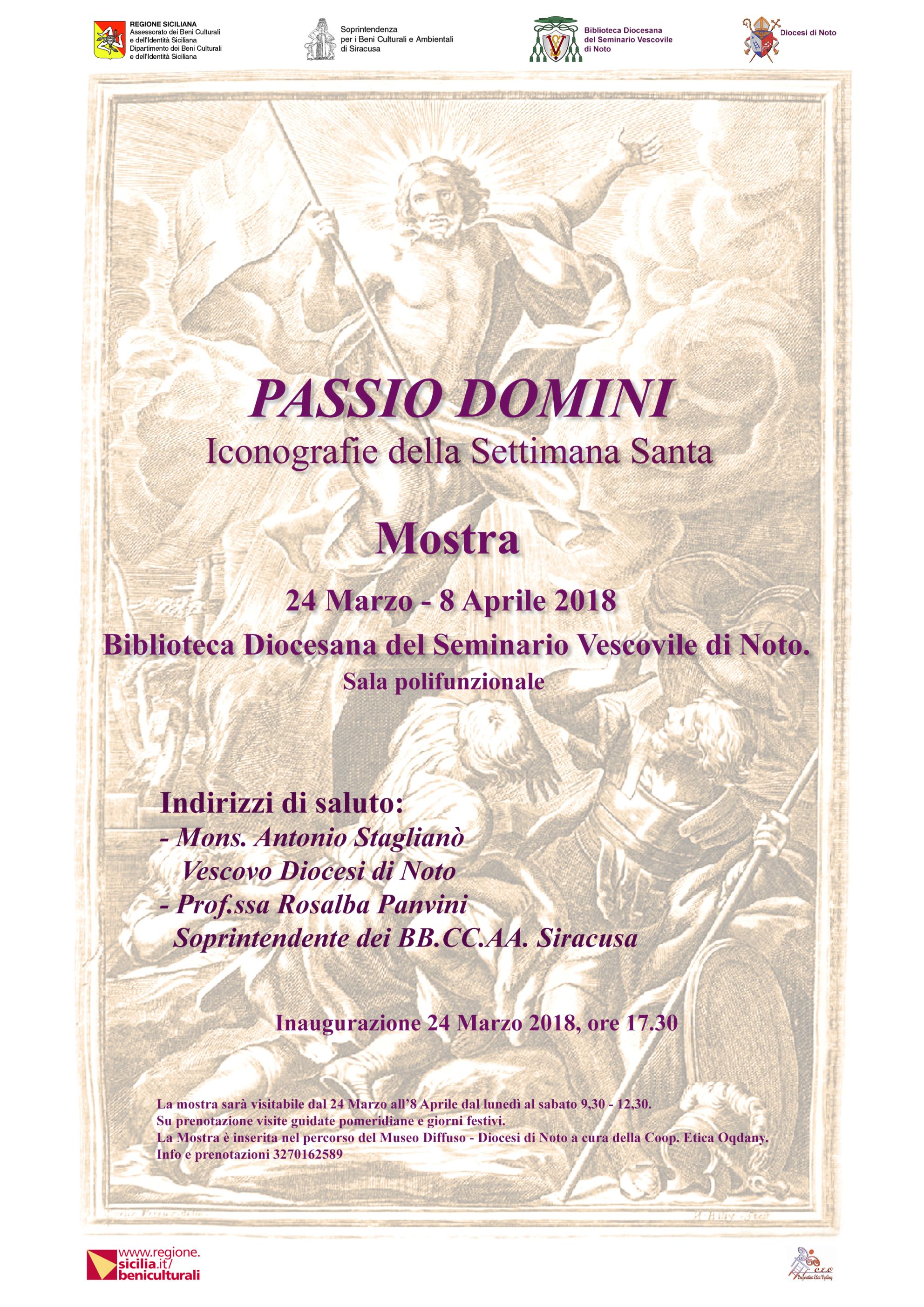 La mostra sarà inaugurata dal Vescovo di Noto Mons. Antonio Staglianò, sabato 24 Marzo 2018 alle ore 17.30, nella Sala Polifunzionale della Biblioteca Diocesana del Seminario Vescovile di Noto, la Mostra dal titolo "Passio Domini", realizzata in sinergia con la Soprintendenza per i Beni Culturali e Ambientali di Siracusa.