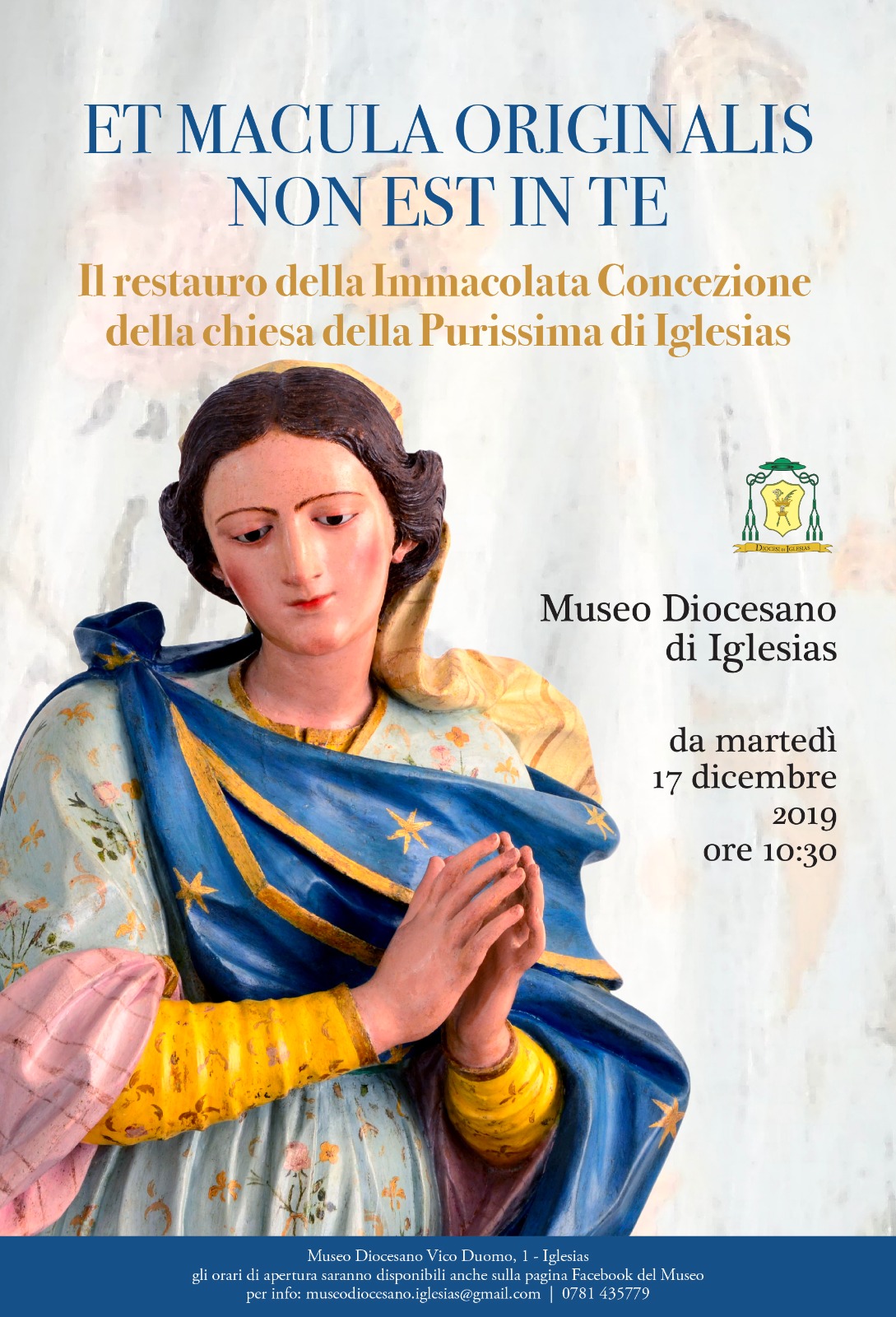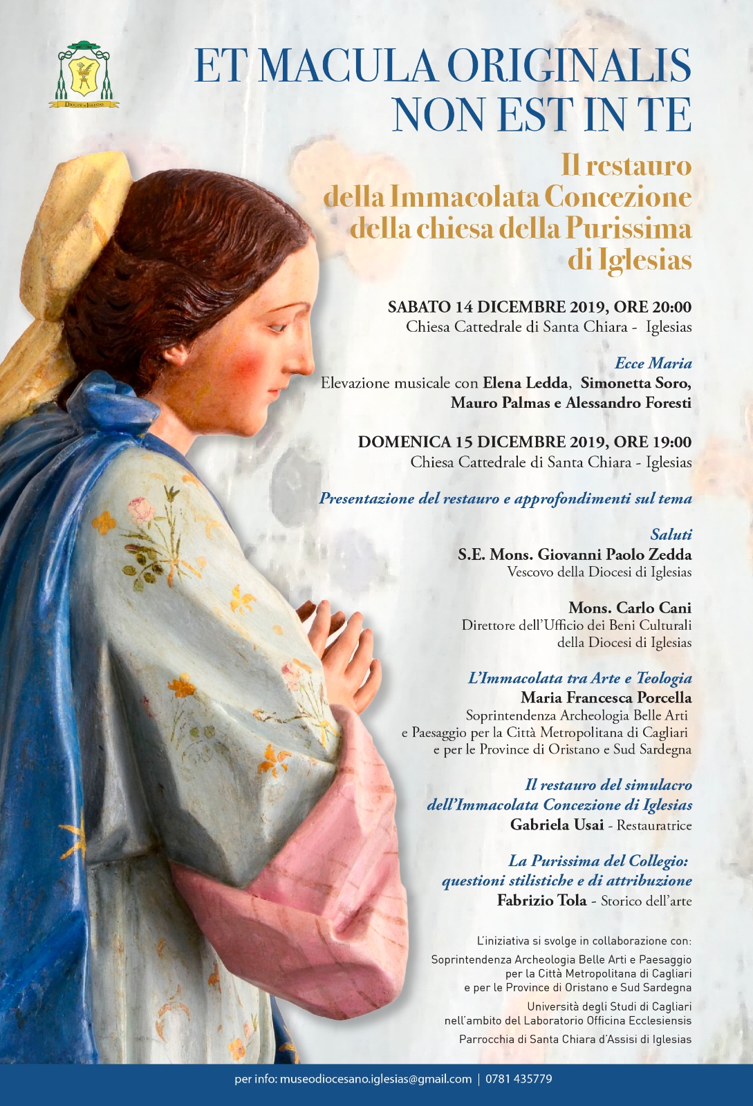 In occasione dell'ultimazione del restauro del simulacro della Immacolata Concezione della chiesa ex gesuitica della Purissima di Iglesias, l'Ufficio Beni Culturali e Edilizia di Culto della Diocesi iglesiente propone una serie di iniziative dedicate all'avvenimento. L'intervento conservativo, programmato nel contesto delle attività di salvaguardia e della valorizzazione del patrimonio culturale diocesano promosse dall'Ufficio, ha restituito alla città un'opera dal grande valore devozionale, la cui importanza dal punto di vista storico artistico, certamente già nota, risulta incrementata dai risultati emersi in questa occasione per quanto concerne il restauro in senso stretto e dalla ricognizione storico documentaria che è stata condotta parallelamente ad esso.