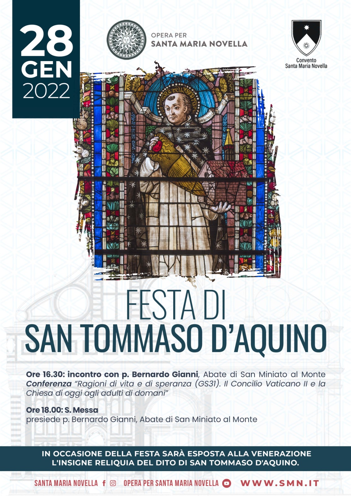 Tutta la comunità domenicana di S.Maria Novella - insieme all'Opera per S. Maria Novella - invitano a partecipare al pomeriggio organizzato per il prossimo 28 gennaio nella Basilica di S. Maria Novella per celebrare S. Tommaso d'Aquino.
