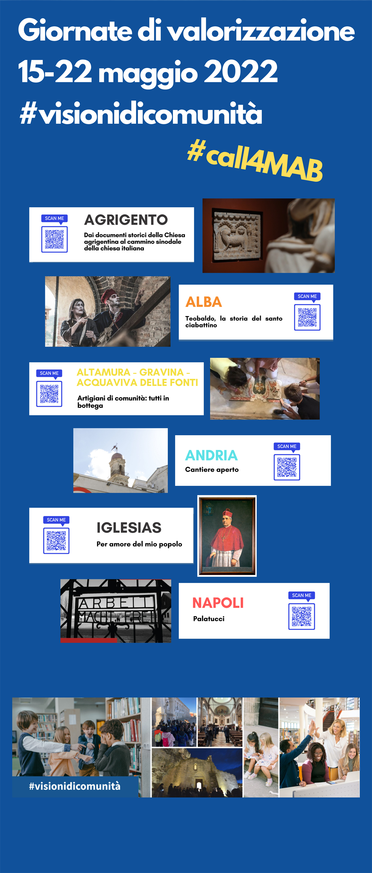 Il convegno rappresenta anche il momento di apertura e inaugurazione delle Giornate di valorizzazione del patrimonio culturale ecclesiastico #visionidicomunità che si svolgono dal 15 al 22 maggio 2022. Una sessione del convegno sarà dedicata proprio alla presentazione di alcune tra le tante iniziative organizzate in occasione di queste giornate (vedi allegato con le iniziative #visionidicomunita' presenti al convegno, evidenziate a seguito della #call4MAB).
