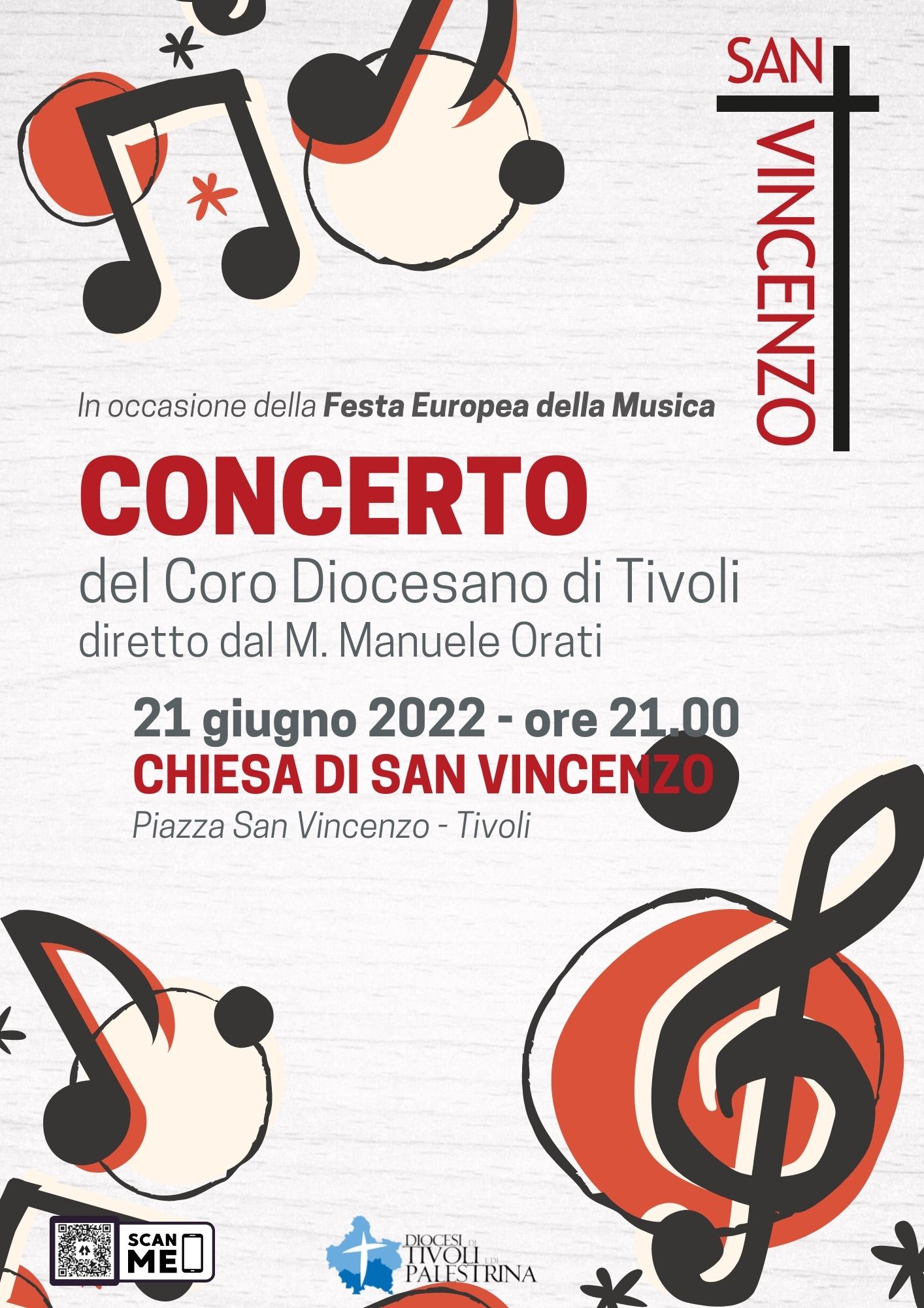 In occasione della Festa della Musica 2022, la Diocesi di Tivoli propone un concerto di musica sacra da parte del Coro diocesano di Tivoli, diretto dal Maestro Manuele Orati, martedì 21 giugno 2022, alle ore 21.00, presso la Chiesa di San Vincenzo in Tivoli (Piazza San Vincenzo – Via Colsereno).