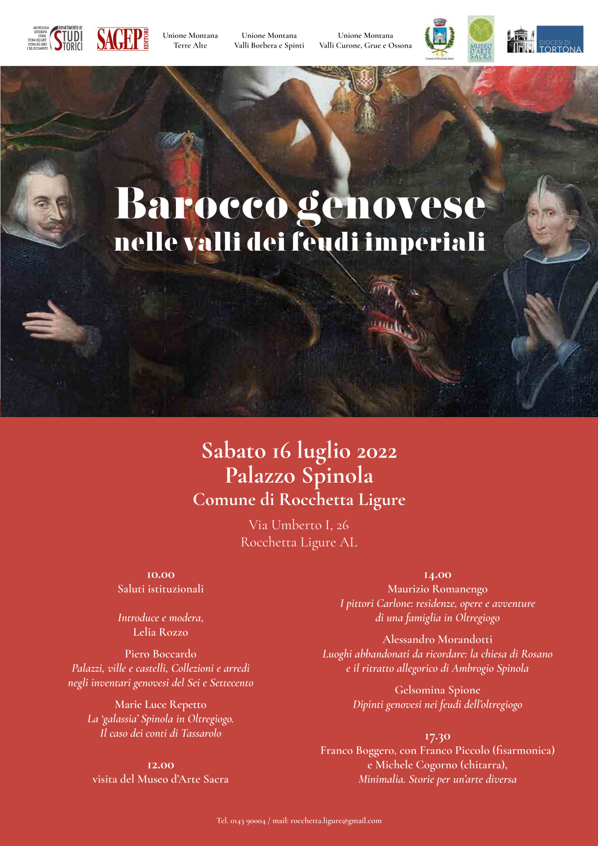 Intorno a questi temi dei feudi genovesi e del patrimonio artistico custodito nelle nostre valli, il 16 luglio a Rocchetta Ligure sarà proposta una giornata di studi, che si svolgerà nel salone al piano nobile di Palazzo Spinola, con interventi dei massimi esperti di Barocco genovese. La giornata intende infatti porsi in dialogo con le mostre dedicate a questo tema in corso a Genova, grazie alla collaborazione dell'editore Sagep coinvolto nelle iniziative genovesi.