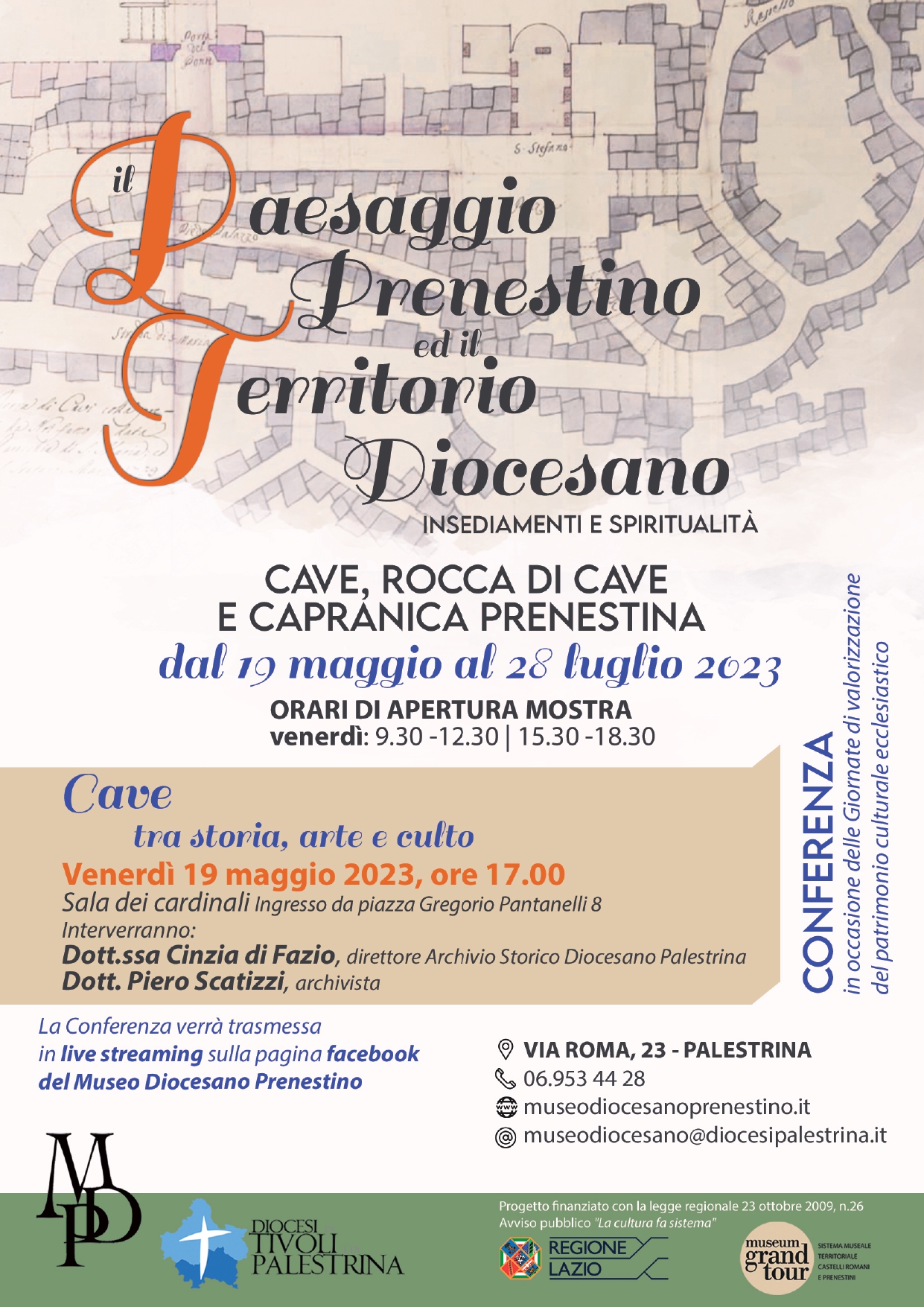 Il Museo Diocesano Prenestino di arte sacra, l'Archivio Storico e la Biblioteca Diocesana invitano in modo particolare a partecipare alla conferenza di approfondimento che si terrà venerdì 19 maggio alle 17.00, nella Sala dei Cardinali, con ingresso dall'episcopio, in piazza Gregorio Pantanelli 8, in occasione dell'apertura della mostra e nel contesto delle Giornate di valorizzazione del patrimonio culturale ecclesiastico, 13 - 21 maggio 2023.