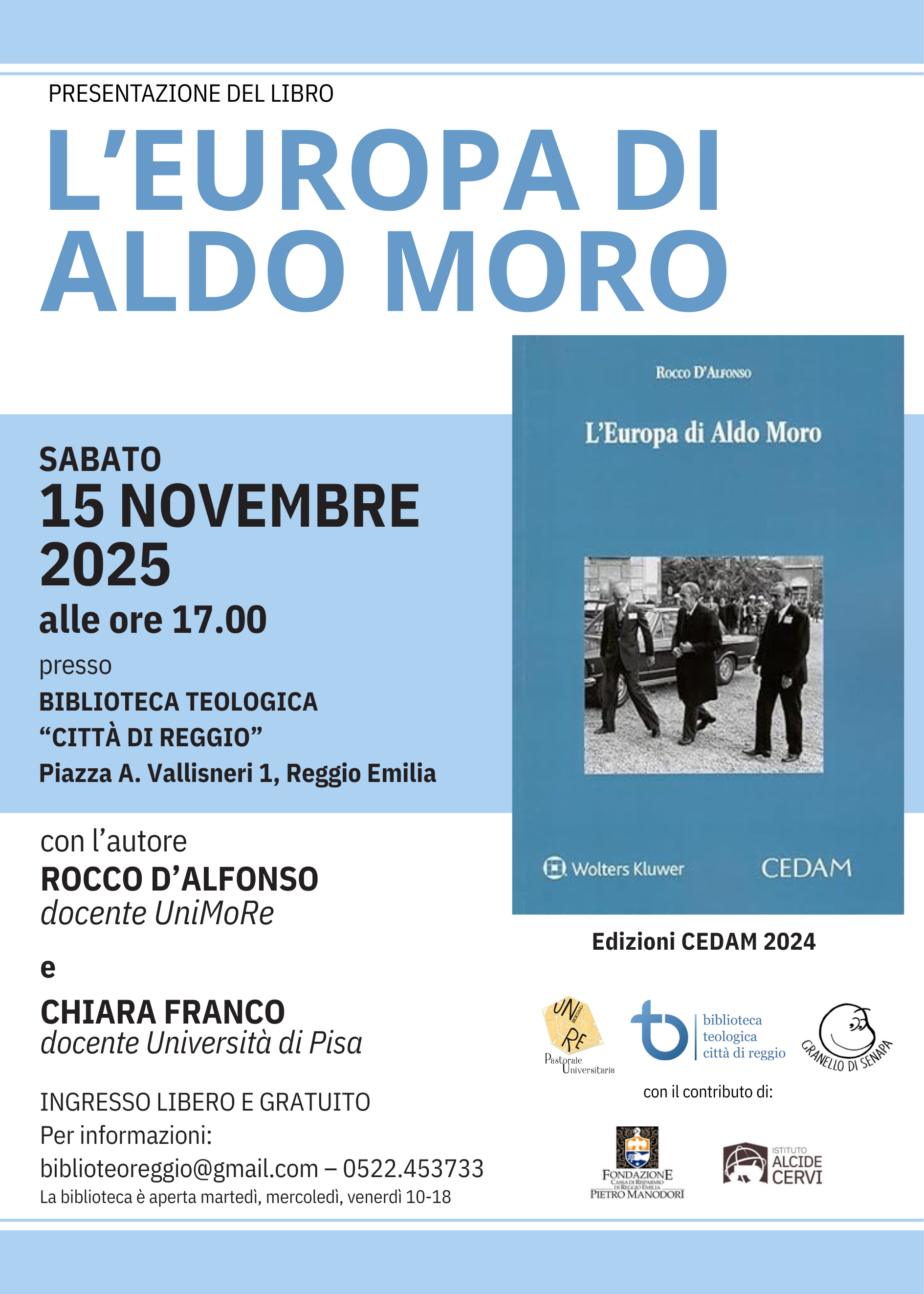 Alle ore 17 di sabato 15 novembre si terrà, presso la Biblioteca Teologica Città di Reggio, la presentazione del libro "L'Europa di Aldo Moro" di Rocco D'Alfonso, professore di Storia Contemporanea presso l'Università di Modena e Reggio Emilia.