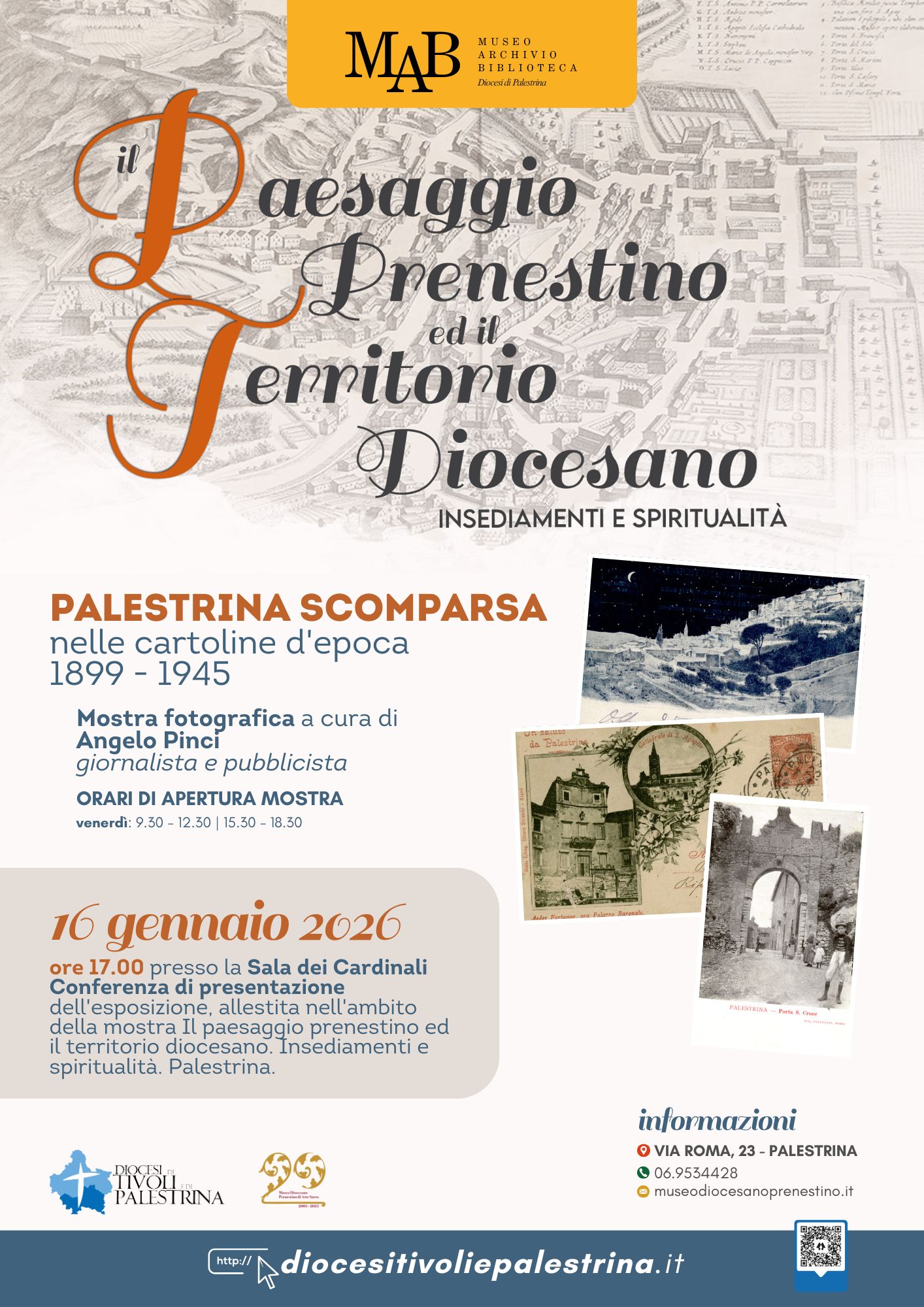 Il MAB, Museo di arte sacra, Archivio storico e Biblioteca, della Diocesi di Palestrina, è lieto di annunciare che venerdì 16 gennaio alle 17, presso la Sala dei Cardinali, in Episcopio, sarà aperta l'esposizione "Palestrina scomparsa nelle cartoline d'epoca. 1899-1945", mostra fotografica a cura del collezionista Angelo Pinci, giornalista e pubblicista prenestino, che interverrà con una conferenza di presentazione.